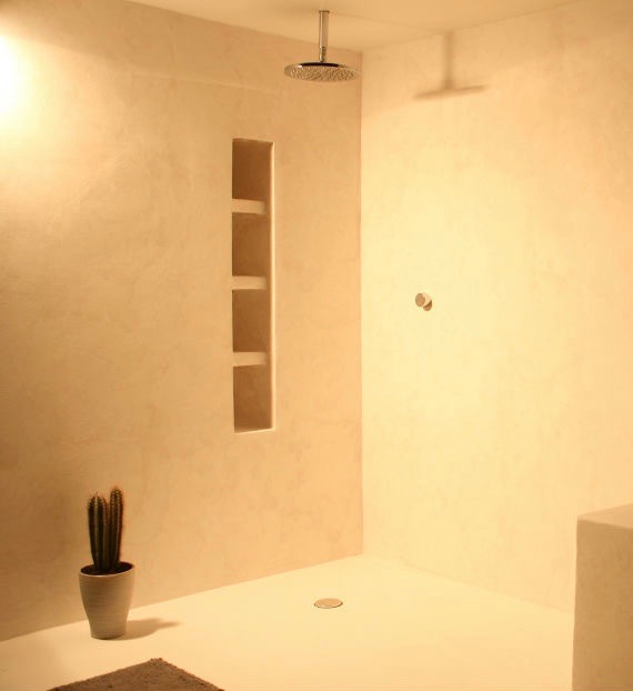 Tadelakt is a mixture of limestone plaster and pigments combined ,under its luxurious surface and occational micro crazing the shift in colour shades creates a sentual and tranqual bathroom experience. This waterproof and yet breathable material is so ancient it is now used throughout the world.